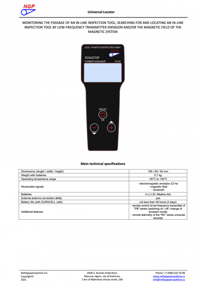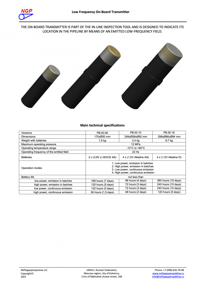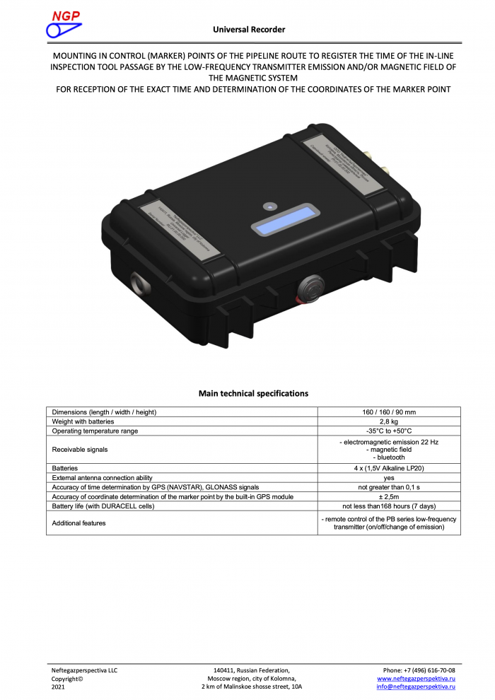 Installed in the control (marker) points of the pipeline route to register the time of passage of the in-line tool by the emission of the low-frequency transmitter and/or magnetic field of the magnetic system.